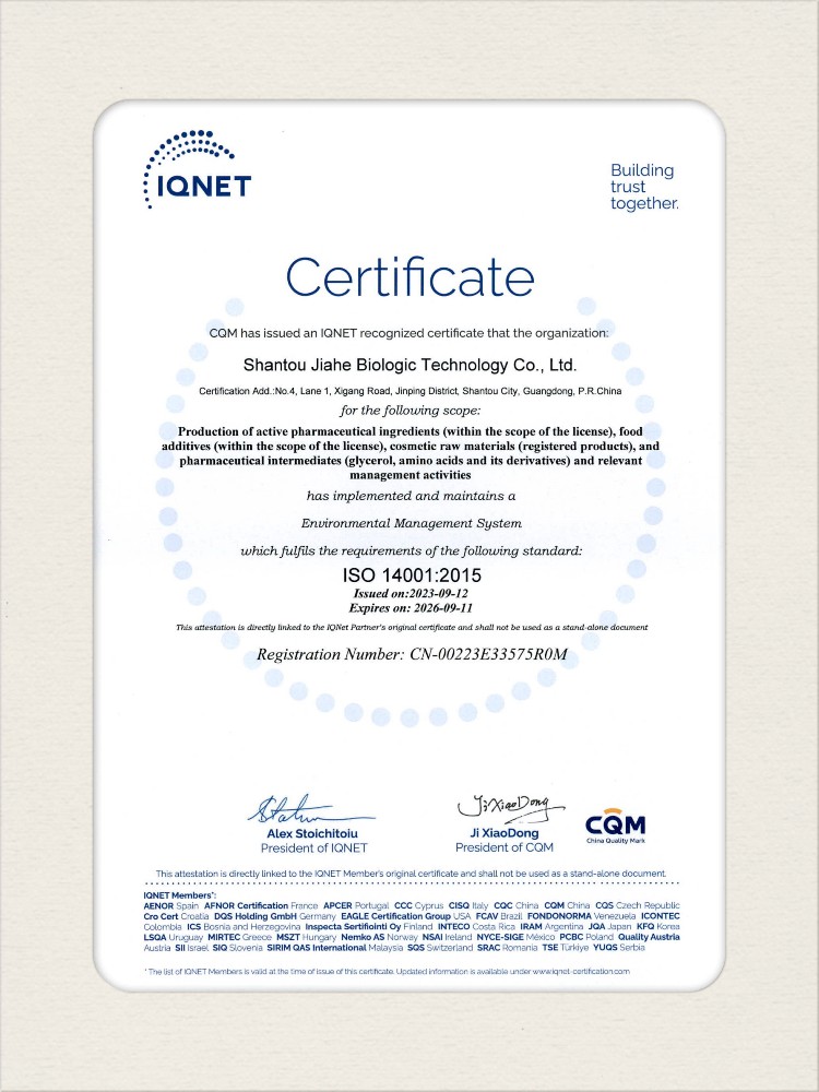 汕頭佳禾生物科技有限公司是一家致力于氨基酸及其衍生物研發(fā)、生產(chǎn)和銷售的國家高新技術(shù)企業(yè),先后通過了國家藥品GMP認(rèn)證,ISO9001質(zhì)量體系認(rèn)證、ISO14001環(huán)境管理體系認(rèn)證。目前,公司擁有“廣東省專精特新中小企業(yè)”、“廣東省氨基酸產(chǎn)品工程技術(shù)研究中心”、“汕頭市生物發(fā)酵工程技術(shù)研究開發(fā)中心”、“汕頭市知識產(chǎn)權(quán)優(yōu)勢企業(yè)”、“多項(xiàng)國家發(fā)明專利”、“廣東省守合同重信用企業(yè)”等多項(xiàng)資質(zhì)和榮譽(yù),旗下“佳禾牌”系列產(chǎn)品已成為原料藥行業(yè)知名品牌。 新泰市佳禾生物科技有限公司成立于2012年8月,注冊資金2億元,公司位于山東泰安新泰市新汶工業(yè)園區(qū),是國 家級高新技術(shù)企業(yè)、山東省“專精特新”企業(yè)、山東省制造業(yè)單項(xiàng)冠軍企業(yè)、泰安市科技型中小企業(yè)、泰安市農(nóng)業(yè)產(chǎn)業(yè)化龍頭企業(yè)、中國生物發(fā)酵產(chǎn)業(yè)協(xié)會理事單位。